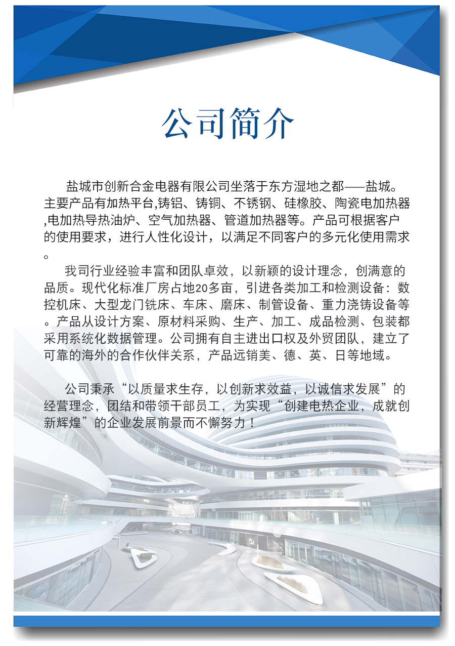 歡迎訪問鹽城市創(chuàng)新合金電器有限公司官方網(wǎng)站!主營產(chǎn)品:加熱平臺,鑄鋁加熱器,鑄銅加熱器,陶瓷加熱器等